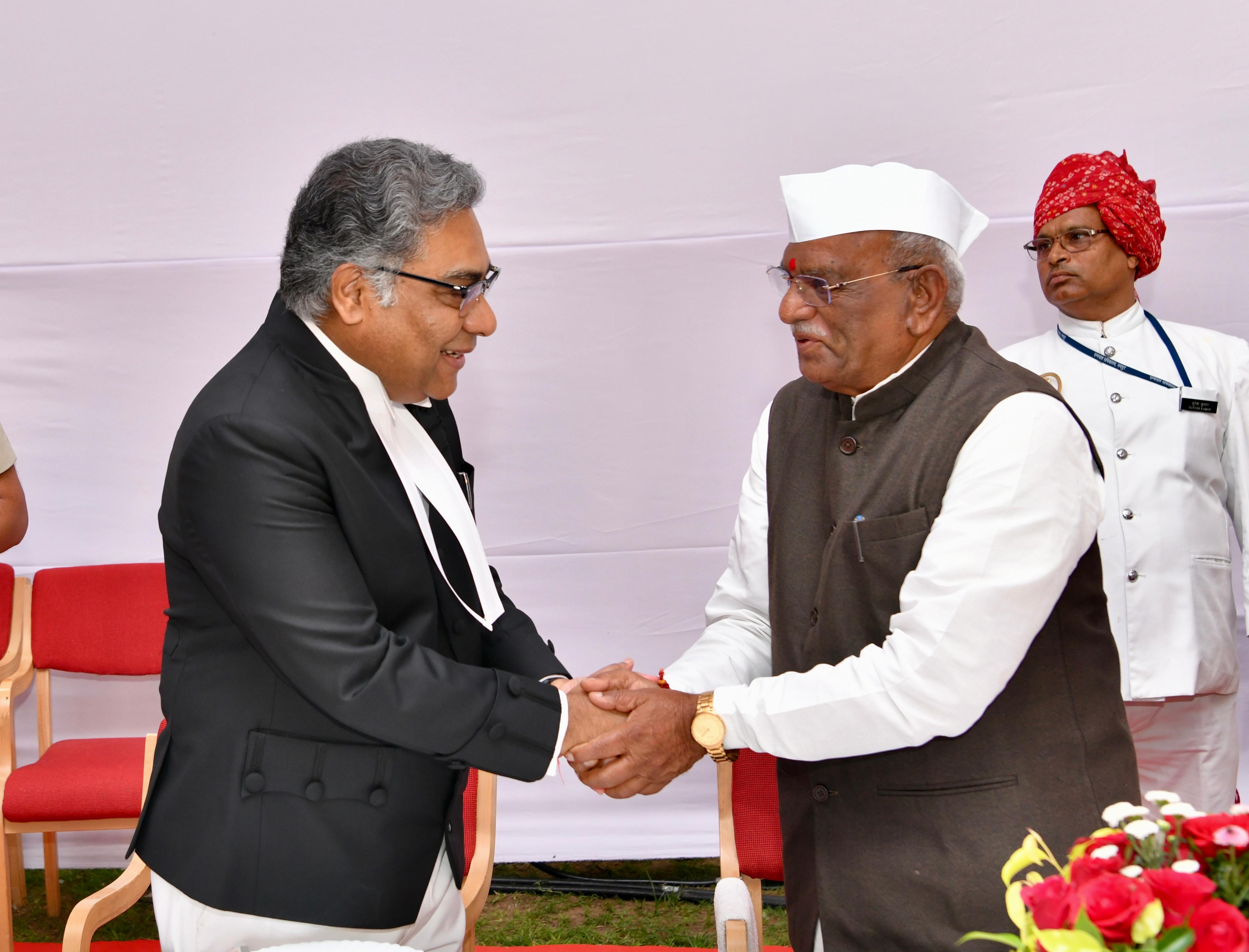 The Chief Justice of Rajasthan, Shri Justice Manindra Mohan Shrivastava administering the oath of the office of the Governor of Rajasthan to Shri Haribhau Kisanrao Bagde, at a swearing-in ceremony at Lok Bhavan Jaipur, on July 31, 2024.